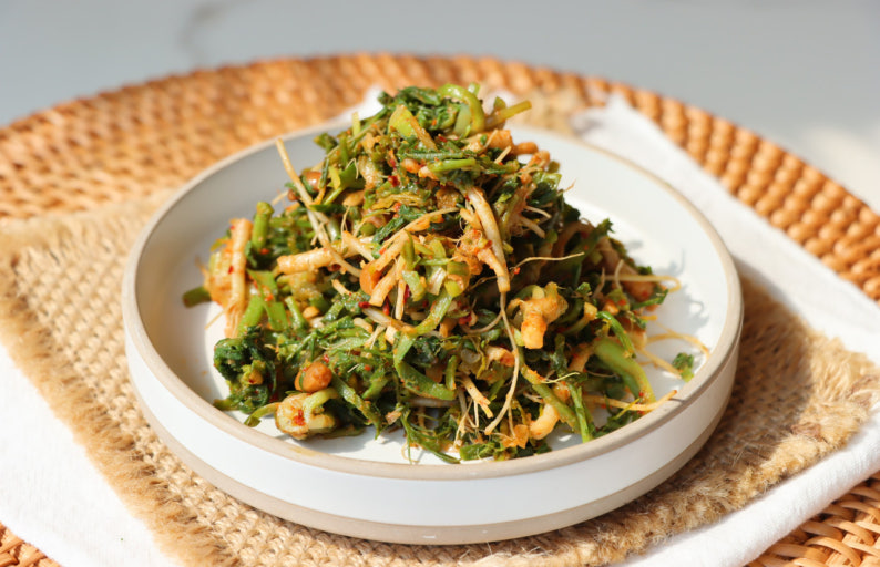 냉이의 뿌리는 흙이 많고 잔뿌리가 많아 손질이 중요합니다. 뿌리 끝을 잘라내고, 뿌리와 줄기 사이를 칼로 다듬어 주세요. 잔뿌리는 칼로 살살 긁듯이 제거하고, 흐르는 물에 가볍게 씻어주세요. 이 과정을 정성껏 해야 깔끔하고 비린내 없는 무침이 됩니다.