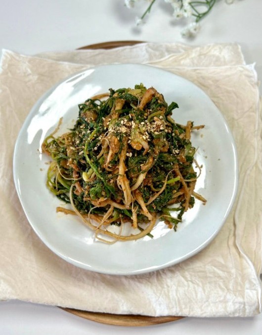 무칠 때 너무 세게 누르면 냉이가 부서질 수 있으니 손끝으로 부드럽게 무쳐주세요. 통깨를 뿌려 마무리!