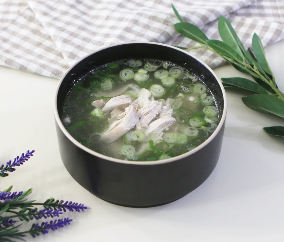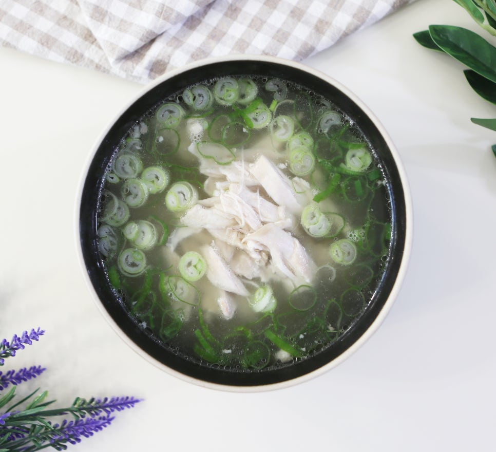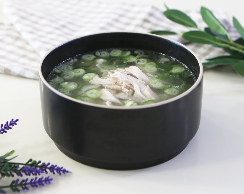 완성된 닭곰탕을 적당한 사이즈의 국물 용기에 옮겨 담은 후 고명으로 준비해 두었던 대파와 찢어둔 고기를 적당량 넣어서 마무리해주세요. (끓일 때 소금과 후춧가루로 밑간을 해주었지만 간이 충분하지는 않으므로 소금을 추가로 넣어서 간을 맞춰주시기 바랍니다.)