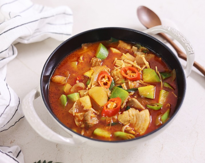뚝배기나 찌개냄비에 담아 따끈따끈하게 바로 내어보세요. 진한 국물과 건더기가 가득한 고추장찌개는 보기만 해도 밥이 절로 당깁니다.