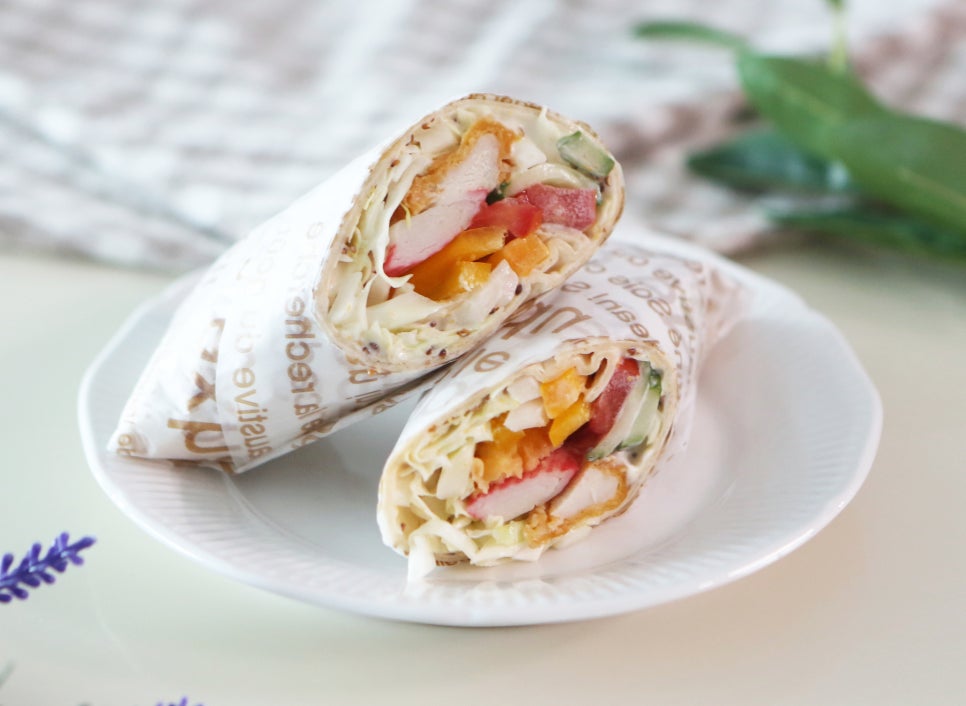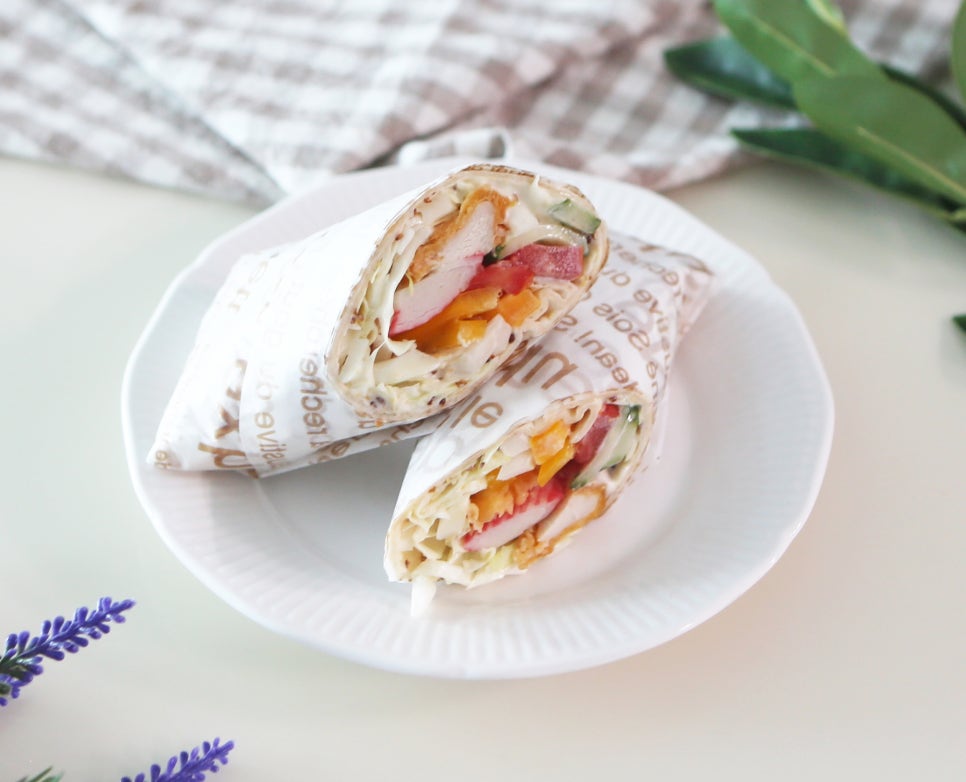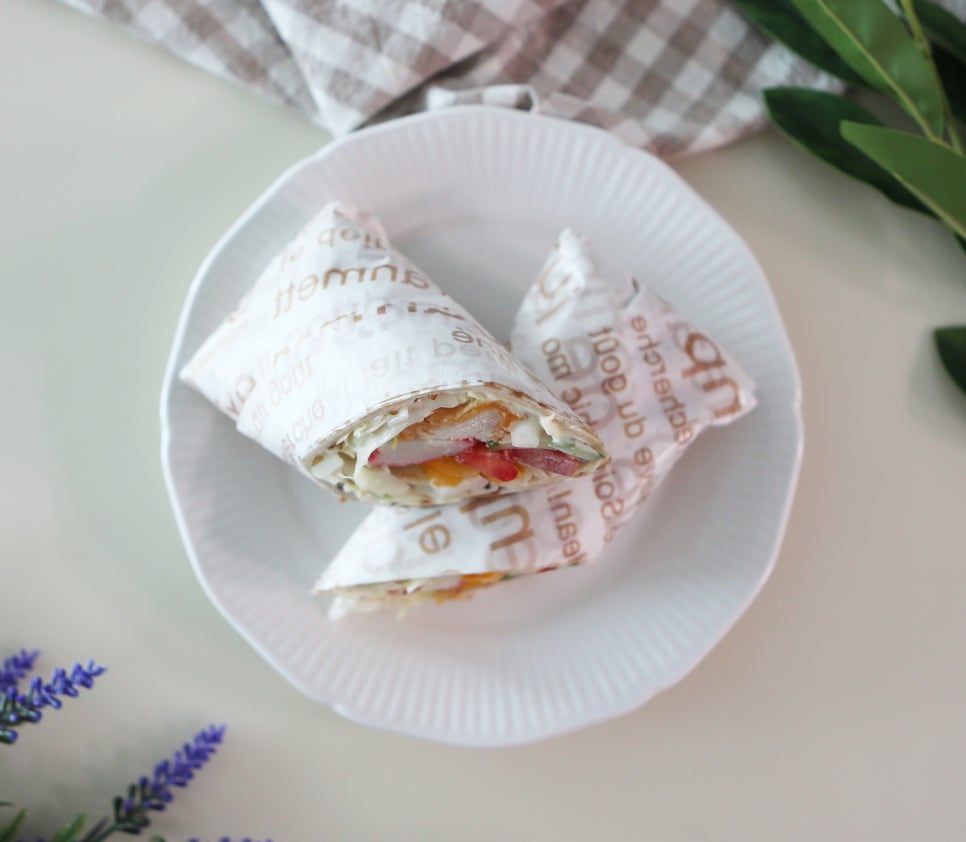 소스를 바른 후에는 양배추를 먼저 올리고 그 위에 나머지 재료들을 올린 다음 빈 공간이 생기지 않도록 토르티야를 당겨서 팽팽하게 말아주세요. 포장이 찢어지지 않도록 2겹의 유산지로 감싸고 이음새 부분을 테이프를 붙여 고정한 다음 양 끝단까지 접어서 테이프로 고정해 주세요.