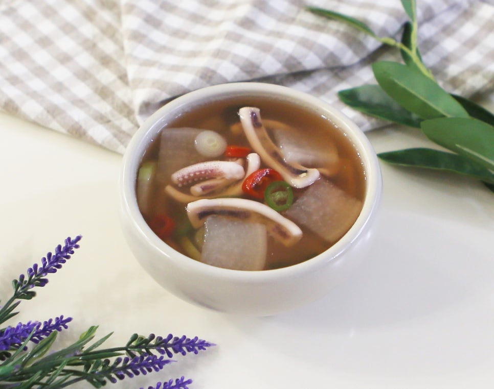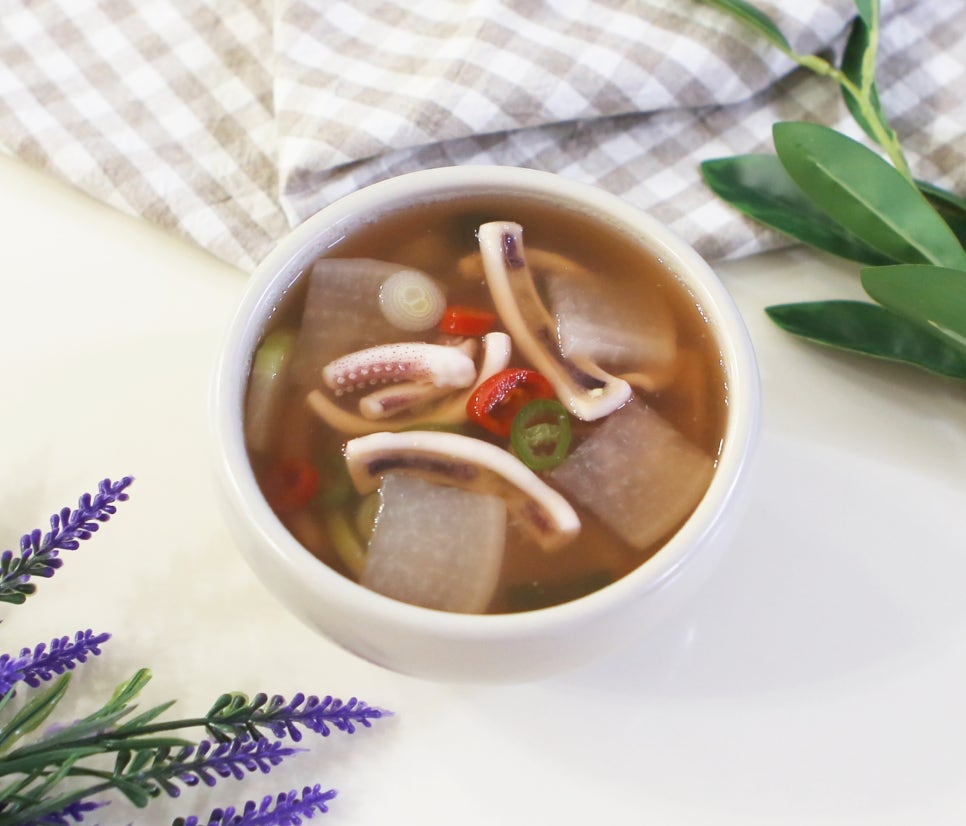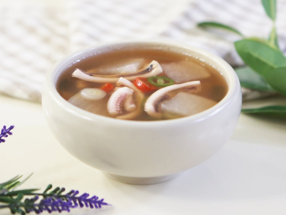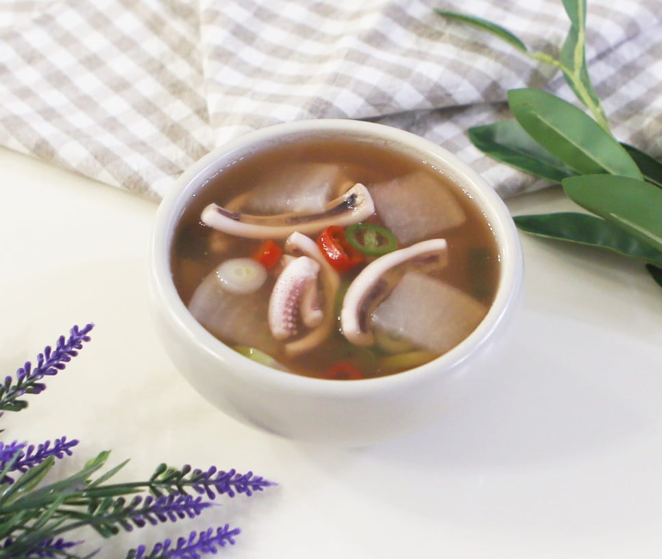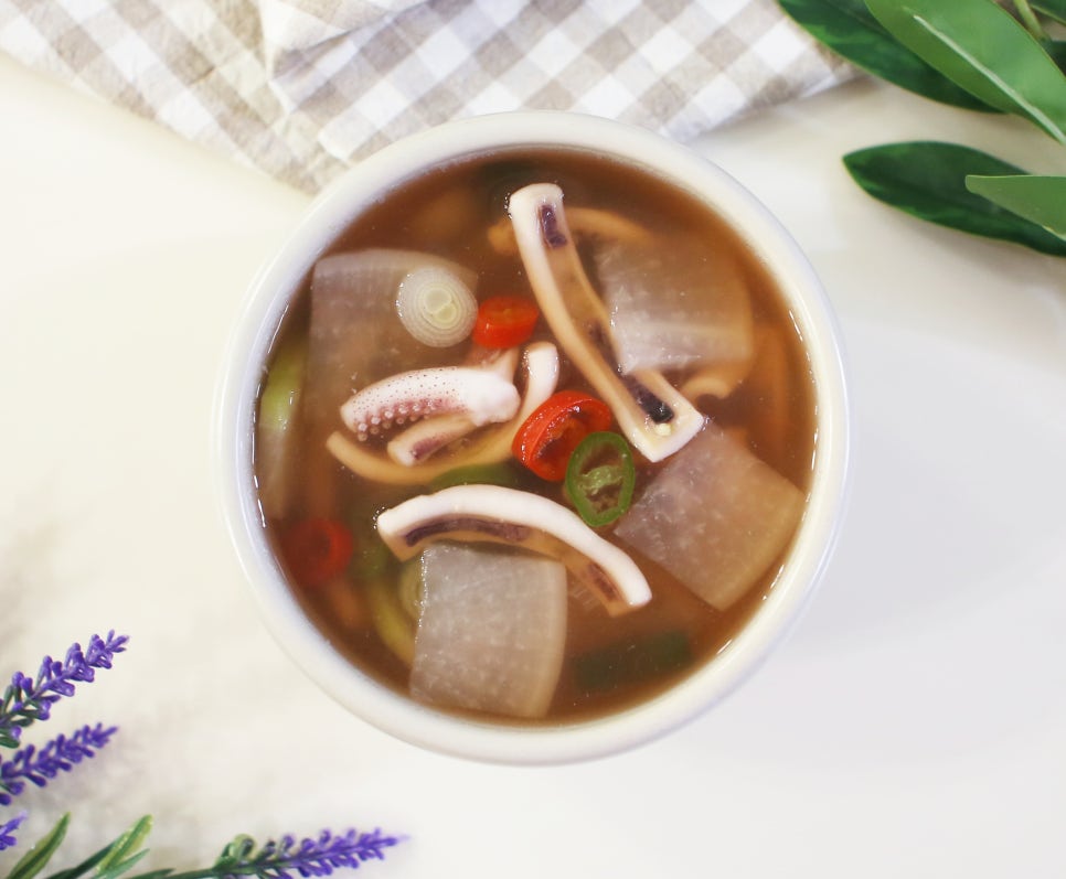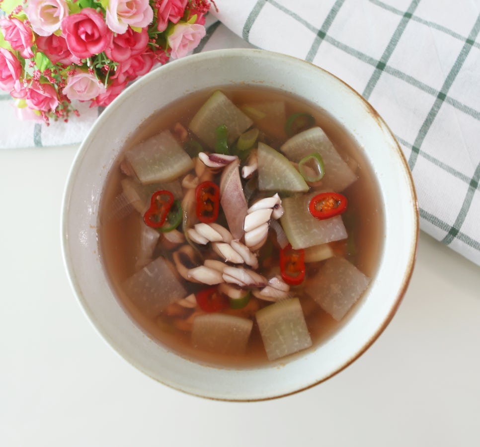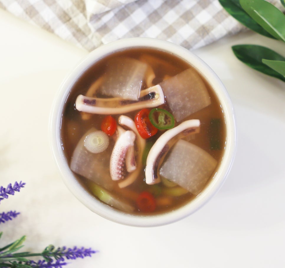 🌟 팁! 오징어는 익는 시간이 짧습니다. 무와 달리 오래 끓이지 않는 것이 쫄깃한 식감을 살리는 비결입니다.