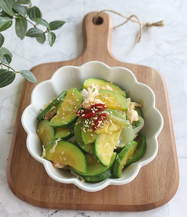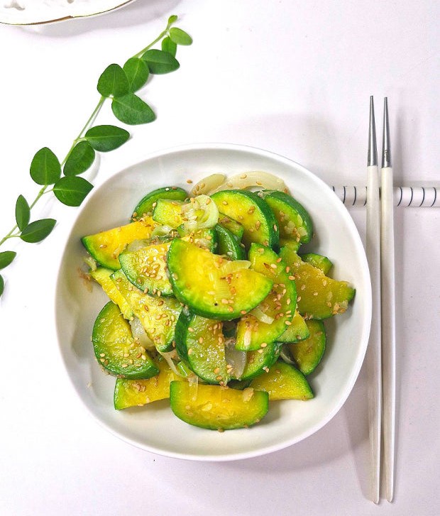 달군 팬에 식용유를 두르고 손질한 애호박을 넣어 중불에서 볶기 시작합니다. 윤기가 돌고 오일 코팅이 되면 다진 마늘과 새우젓을 넣고 볶아주세요. 이때, 고소하면서 짭짤한 풍미가 애호박에 배기 시작합니다.