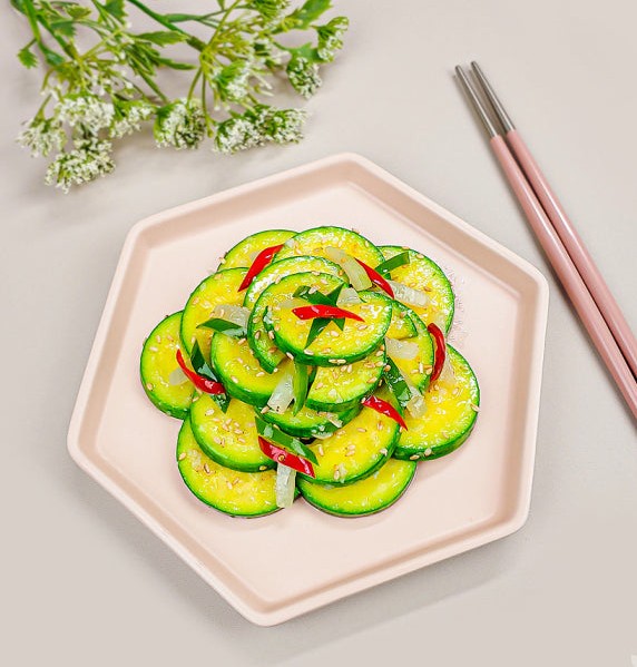 애호박은 흐르는 물에 깨끗이 세척한 후 겉의 물기를 잘 닦아줍니다. 양 끝을 자른 후, 0.5cm 두께로 일정하게 썰어주세요. 썰기 방법은 반달 썰기, 원형 썰기, 열십자 썰기 등 원하는 스타일대로 가능하지만 일정한 두께를 유지해야 익힘이 고르게 됩니다.