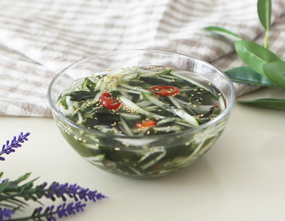 투명한 유리볼에 담으면 냉국의 시원함과 색감이 더 살아납니다. 얼음을 추가하면 더욱 시원하게 즐길 수 있어요. 고명으로 고추를 몇 개 띄우면 색감까지 완벽한 비주얼을 연출할 수 있습니다.