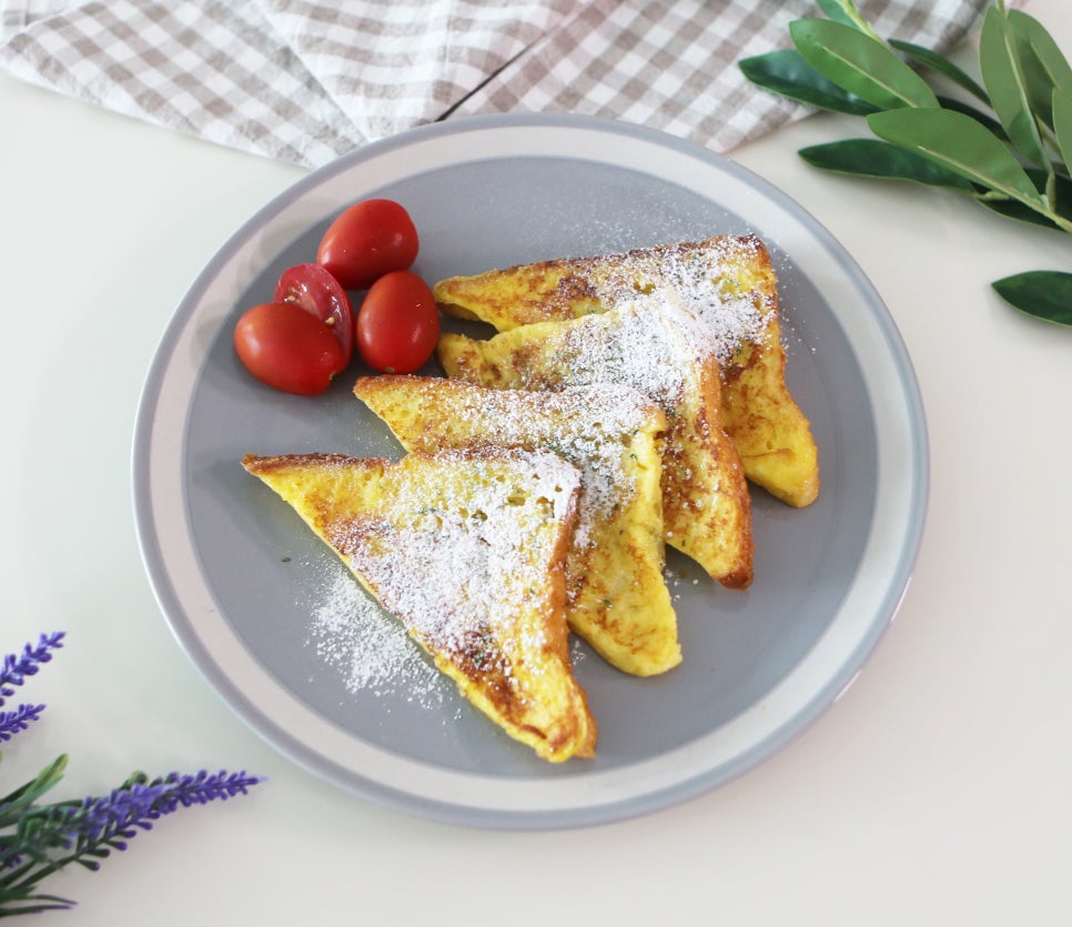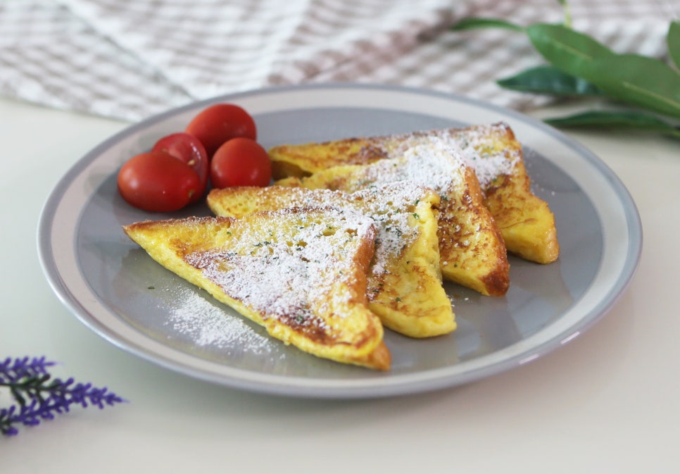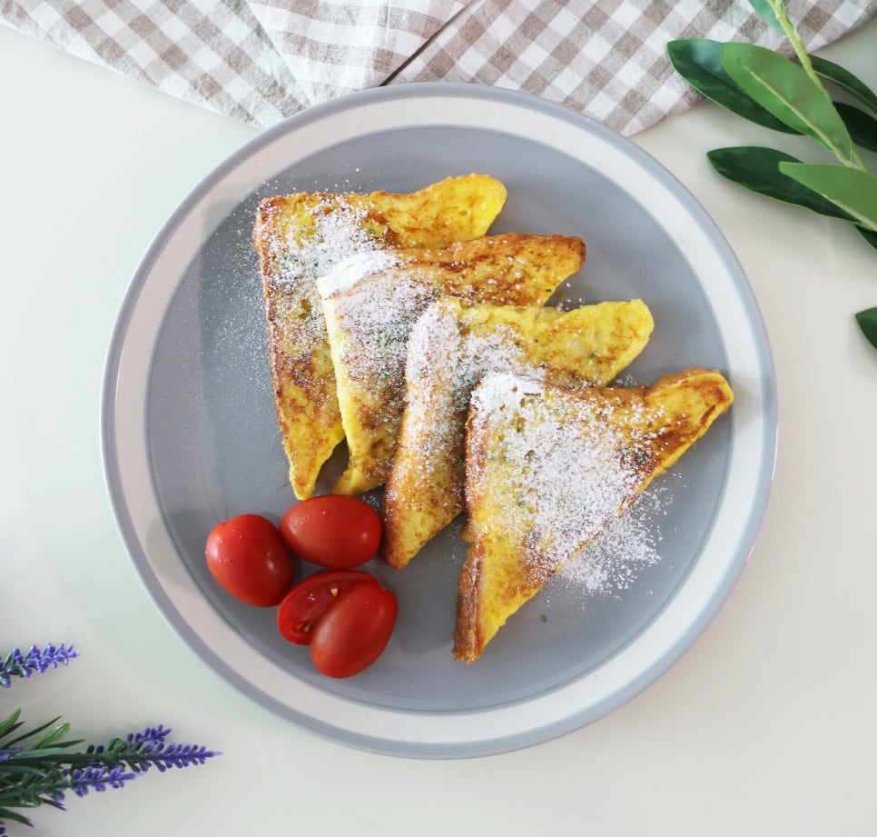 깔끔한 비주얼을 원하신다면 구워낸 토스트에 파슬리 가루만 뿌려주시고, 달달한 맛을 살짝 더해주고 싶으시다면 저처럼 슈거파우더를 고운 채로 걸러서 골고루 흩뿌려서 마무리해 보세요. 방울토마토, 복숭아, 샤인 머스캣, 오렌지 등의 과일을 추가로 준비하면 다채로운 색감으로 인해 좀 더 먹음직스러워 보이는 효과를 연출할 수 있답니다.